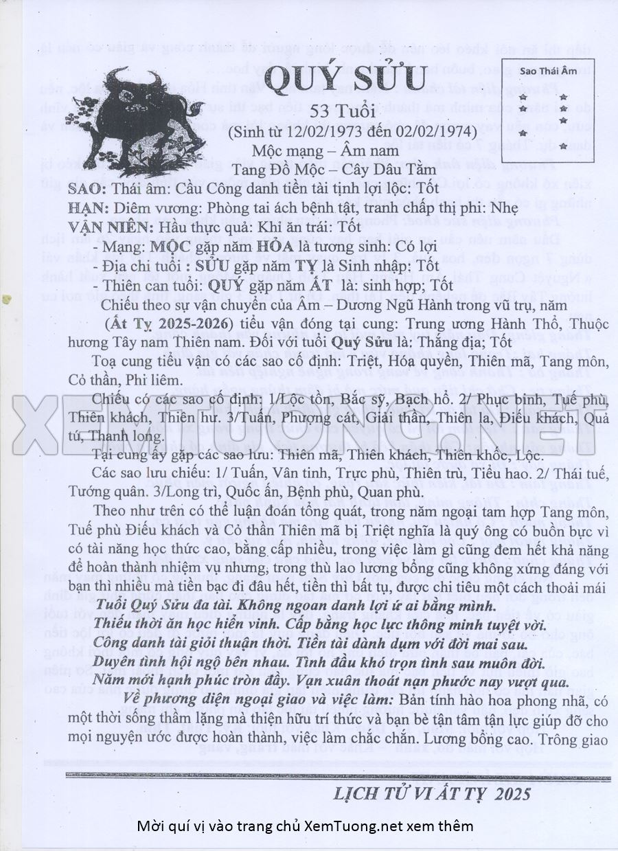 Tử Vi Năm Ất Tỵ 2025 mạng nam QUÝ SỬU