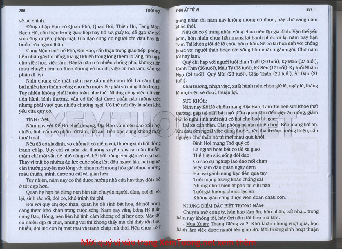 (Lưu ý: Thái Ất Tử Vi được chúng tôi scan từ sách, do đó mỗi tuổi sẽ có nhiều trang, quý vị xem xong hãy nhấn vào trang tiếp theo để xem hết phần tuổi muốn xem. Nếu quý vị xem bằng điện thoại thì hãy kéo qua lại để xem phần bị khuất.)