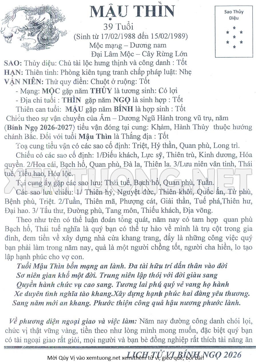 Tử Vi Năm Bính Ngọ 2026 mạng nam MẬU THÌN