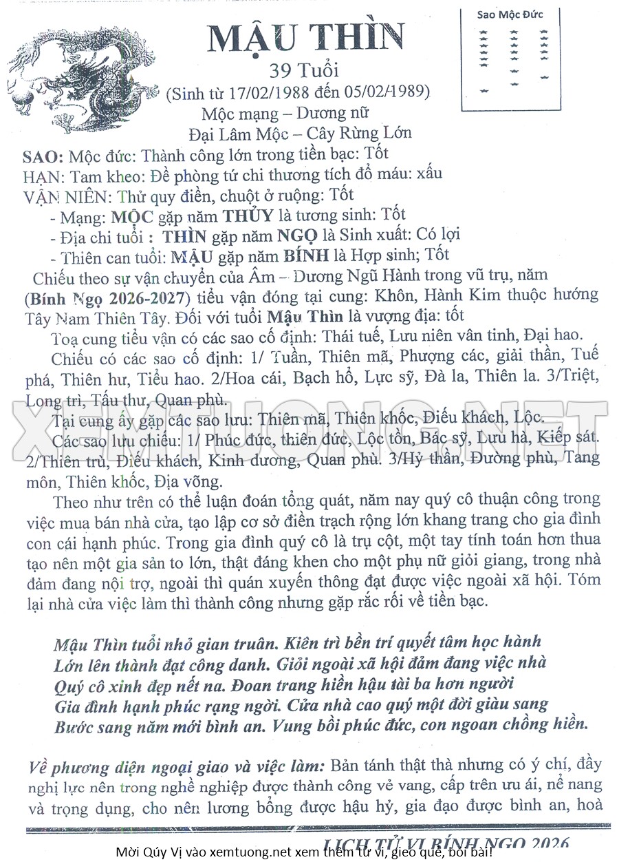 Tử Vi Năm Bính Ngọ 2026 mạng nữ MẬU THÌN