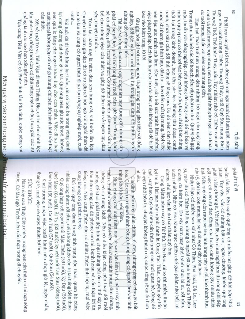 (Lưu ý: Thái Ất Tử Vi được chúng tôi scan từ sách, do đó mỗi tuổi sẽ có nhiều trang, quý vị xem xong hãy nhấn vào trang tiếp theo để xem hết phần tuổi muốn xem. Nếu quý vị xem bằng điện thoại thì hãy kéo qua lại để xem phần bị khuất.)
